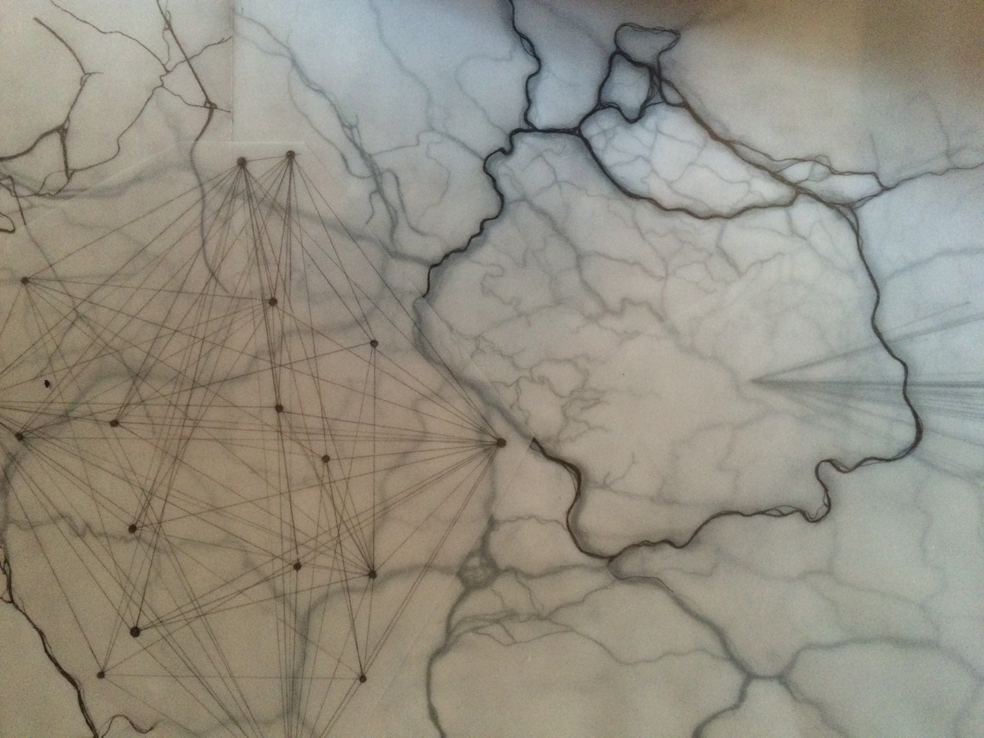 The Trajectory project is composed of many multi-media elements, from large pencil drawings on transparent paper, to video animations of human trajectories. It scales from video animation of bird trajectories to dance performances where the dance floor is itself a drawing.